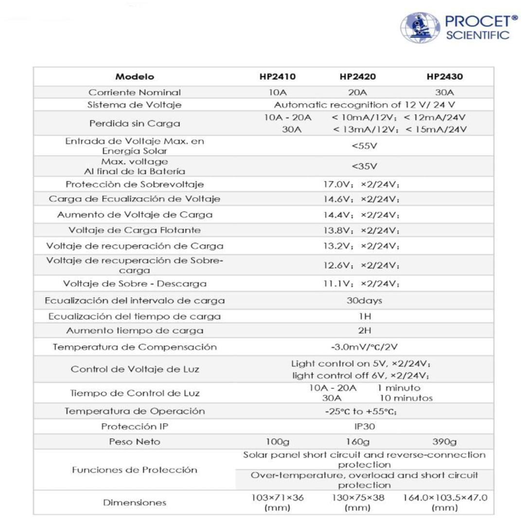 Controlador PWM, 50A 12/24V LCD USB Marca Procet Scientific