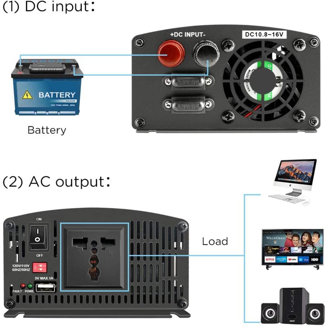 Es un inversor fuera de la red, no conecte los terminales de salida de CA a la red o a la fuente eléctrica, de lo contrario el inversor puede estar dañado.