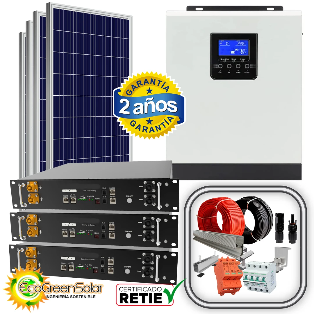 El Kit Solar Para Vivienda Sistema Híbrido 110V AC 19.000Whd 48V Litio incluye paneles solares, un inversor Híbrido, baterías de litio.