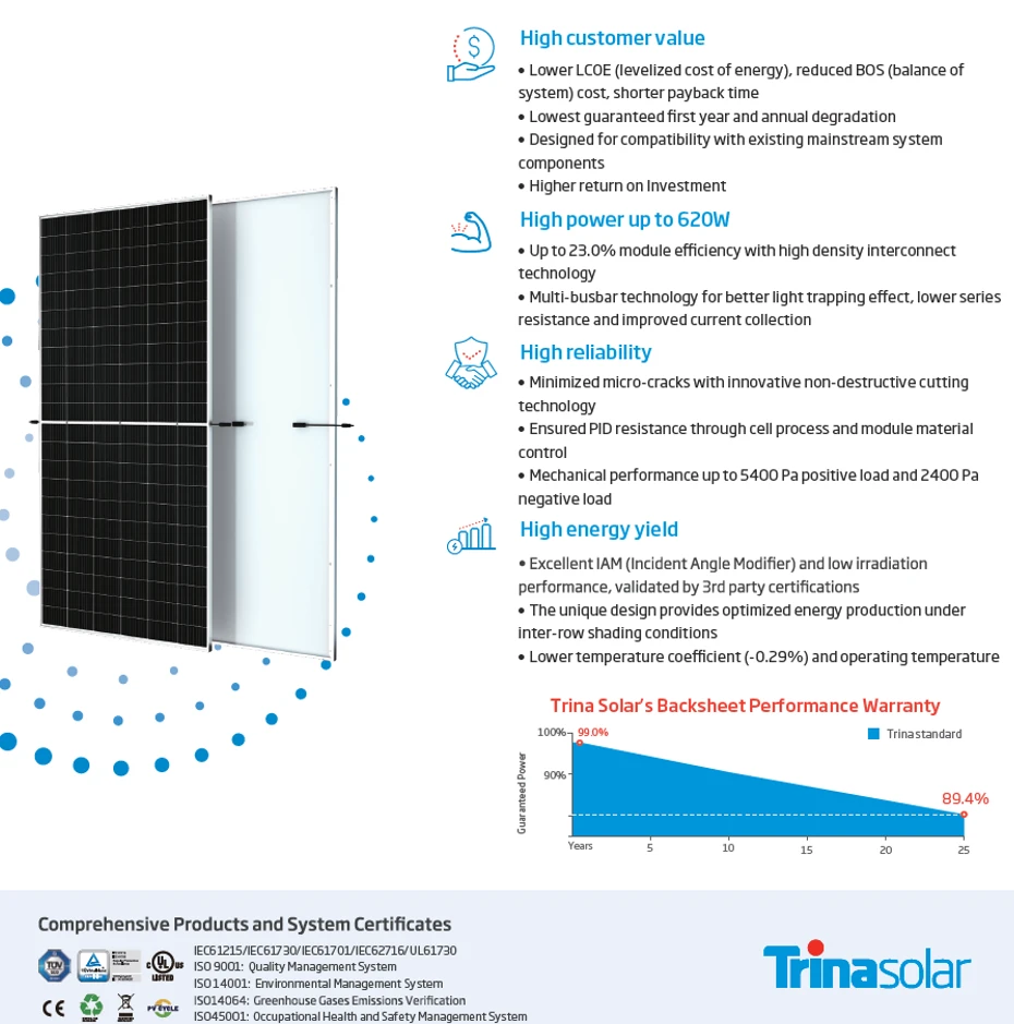 Fabricado con materiales de alta calidad, el Panel Solar 605W Trina está diseñado para soportar condiciones climáticas extremas, incluyendo fuertes vientos, granizo y nieve. Su marco de aluminio anodizado y el vidrio templado aseguran una durabilidad prolongada, reduciendo la necesidad de mantenimiento y reemplazo.